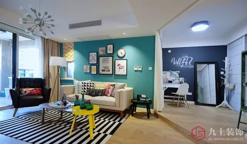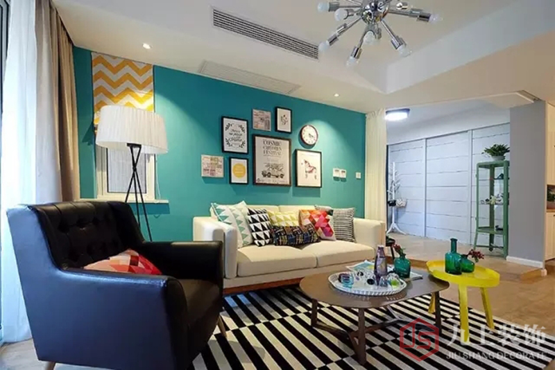 客廳的主色調(diào)是藍,白,黑,黃,四種顏色交織,用一些彩色的抱枕打造趣味,顏色多而不雜。