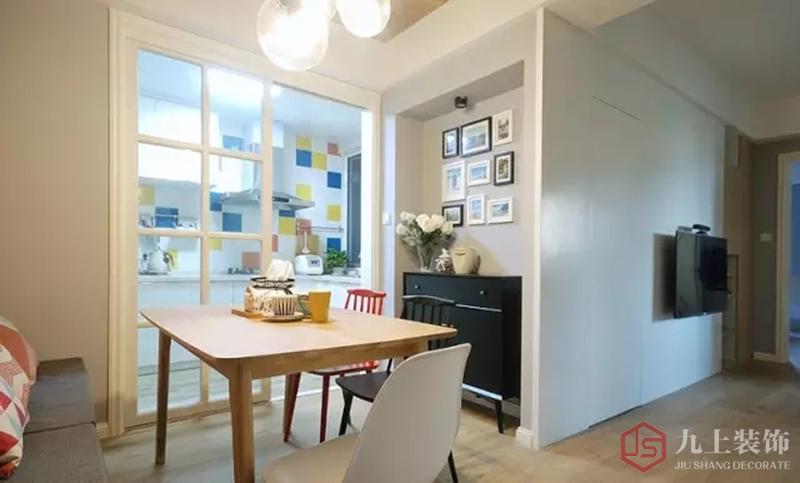 廚房用透明的格子門打造通透感,這樣的推拉門比平開門更適合擁擠的小空間。