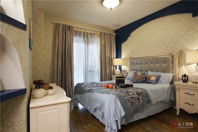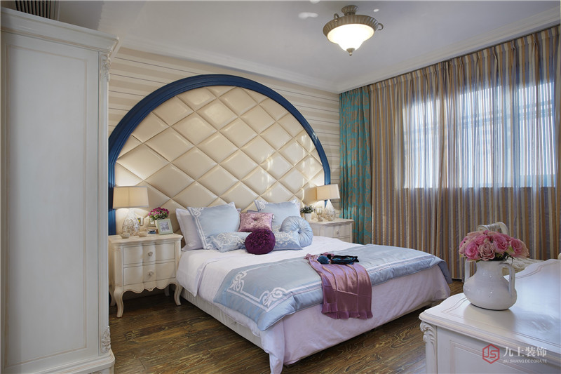 淺色床品、插花讓臥室充滿溫馨,地板、窗簾、墻紙也很搭配。