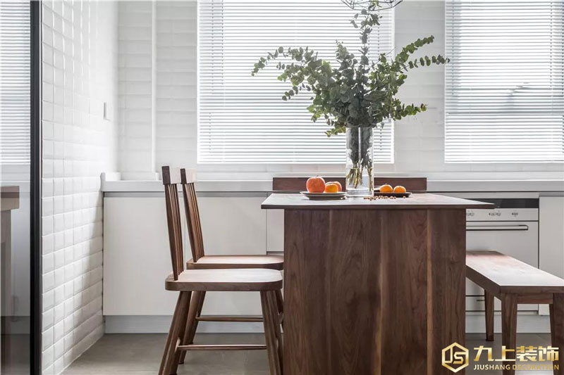 餐桌是板凳以餐椅的搭配,整體木質的餐桌椅搭配,結合墻面白色小磚的墻面,端莊雅致有檔次。