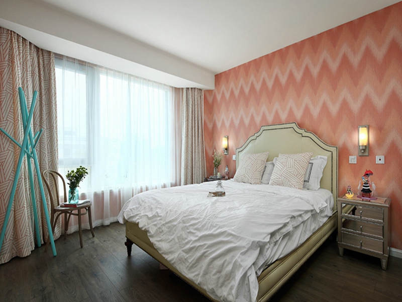 臥室整體風(fēng)格粉嫩,淺色系的床品使室內(nèi)更加明亮。