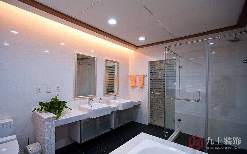 呼應(yīng)的鏡面方正的線條,雙洗手臺(tái)也以方形線條鋪敘相同的表現(xiàn)。