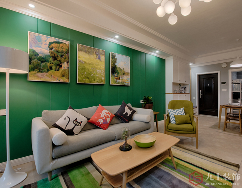 沙發(fā)、茶幾、吊燈、深林綠的墻;簡單、干凈、大氣。