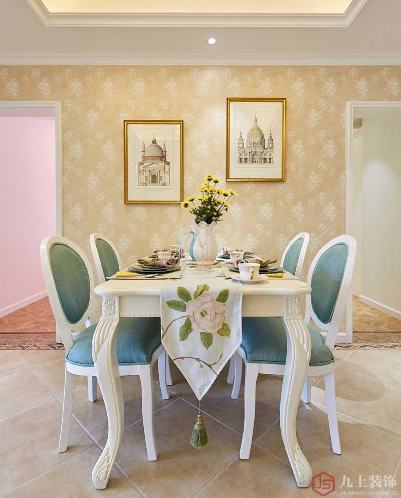 室內(nèi)的空間佈局一氣合成,氛圍和諧統(tǒng)一,米黃色的碎花牆紙、白色的門套,素色布藝田園家俱,使色彩看起來素雅、端莊、舒適、大方
