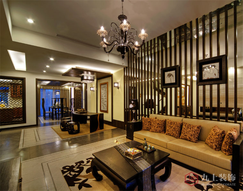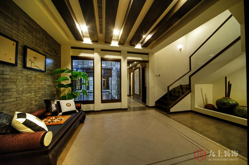 沙發(fā)墻使用文化磚與鏤空窗格很搭配,復(fù)古的掛畫(huà)和棋盤,讓房間更具古典氣息。