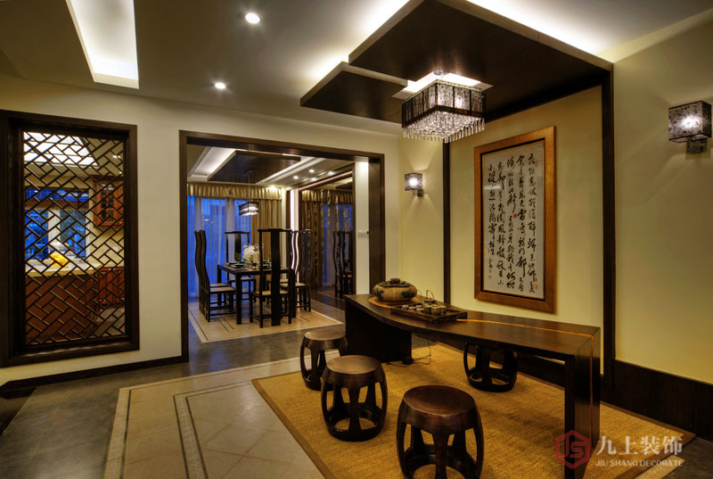 桌子和凳子都是黑色,造型古典,與隔斷和背景墻顏色一致,和諧大氣。