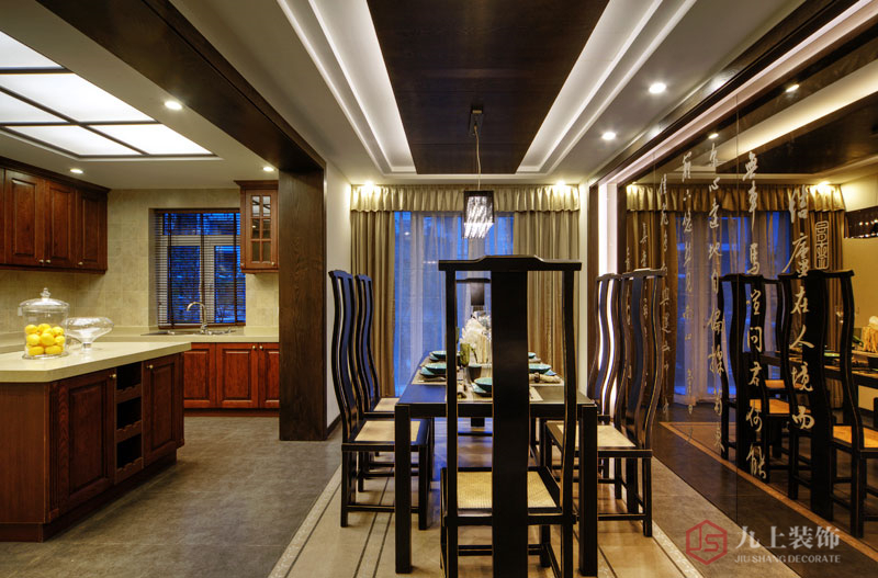 開(kāi)放式廚房節(jié)省空間,實(shí)木櫥柜更顯大氣。餐廳背景墻為鏡子,顯空間大。