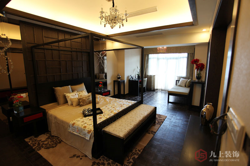 書(shū)桌和凳子的造型比較古典又有禪意,墻上的書(shū)法掛畫(huà)與鏤空窗戶讓房間更添復(fù)古韻味。