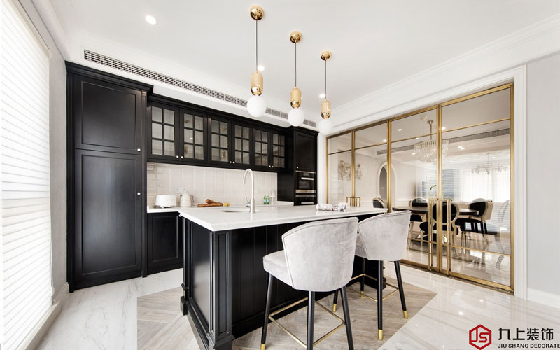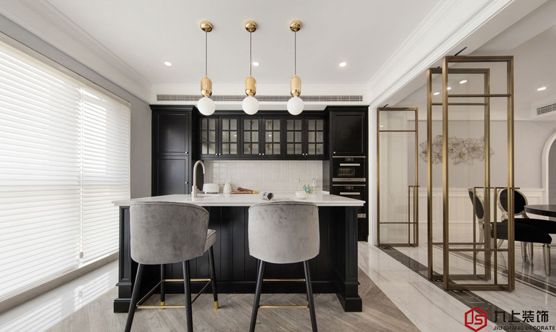 銅質窄框中軸門在很好劃分了餐廳與西廚區(qū)域的同時,也極大的保留了空間的通透性。