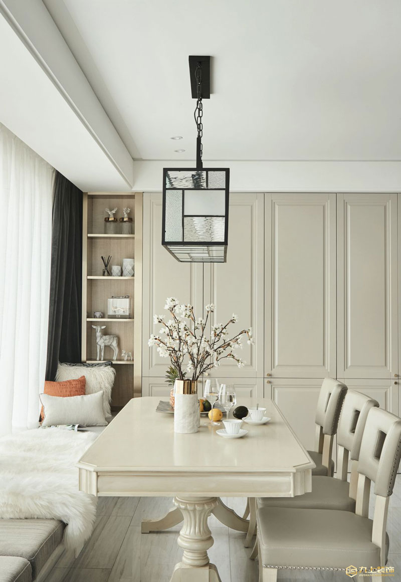 鉚釘皮質(zhì)餐椅顏值高,舒適與質(zhì)感兼具。飄窗是用餐的卡座與是休閑的好地方。
