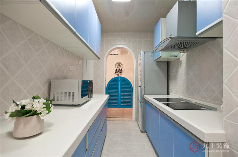 廚房設(shè)置了很多柜子,讓主人可以分門別類的收納廚具。藍(lán)色的拱門、藍(lán)色的櫥柜極具地中海韻味。