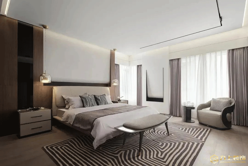 主臥室以木色和白色為基本色調(diào)的設(shè)計,讓私密空間簡潔而又富含浪漫感,不規(guī)則條紋地毯增加了空間的審美氛圍,設(shè)計師精心營造出一個舒適的居住空間,居者晚上可以來一場美好的睡夢之旅。