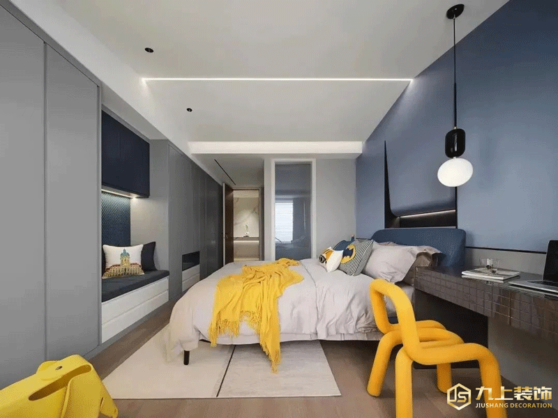 男孩的兒童房以線條的多變和跳動給空間帶來俏皮感。房間中的黃色造型椅子增添了房間的童趣,天藍(lán)色背景墻前的人形手辦是孩子們的最愛。一盞簡約的白色吊燈給整個房間都帶來了明快的光線。