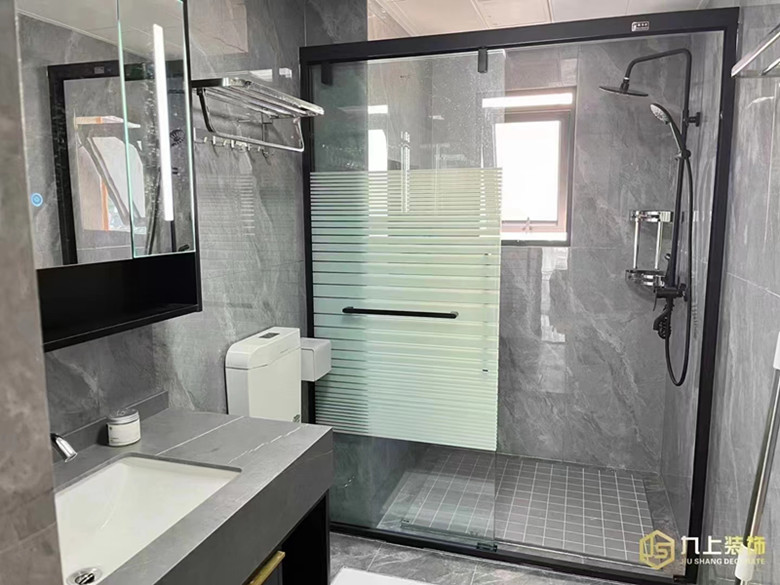 主衛(wèi)的設(shè)計(jì)與整個(gè)空間的氛圍融為一體,采用了仿黑金沙瓷磚的材質(zhì),搭配木色的浴室柜,營造出一種回歸自然的感覺,同時(shí)也讓人感到神秘。