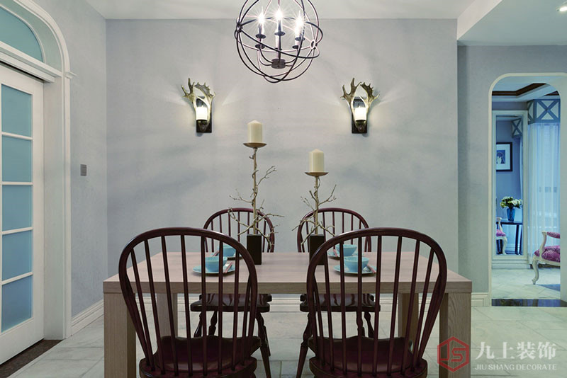 在墻面和門(mén)洞上的處理,采用了青藍(lán)色的墻面,配合著拱形的門(mén)洞,就像是一望無(wú)際的地中海,連綿起伏的波浪,與天形成一道美麗的風(fēng)景線。客戶(hù)是做旅游工作的,裝修上比較喜歡地中海的藍(lán),還有地中海風(fēng)格中拱形的門(mén)洞。在家具上,男主人更喜歡比較有內(nèi)涵和文化氣息的美式家具。