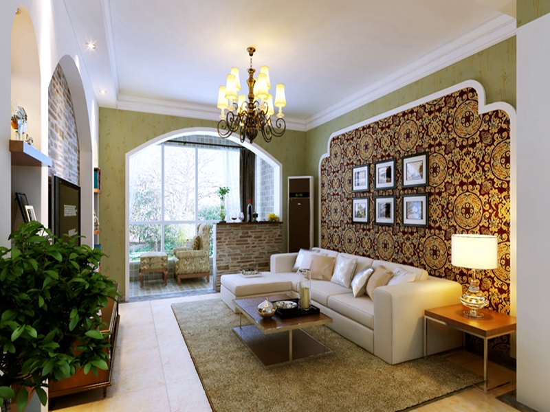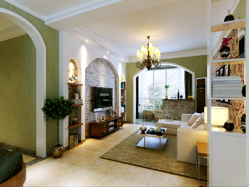 整體設(shè)計(jì)有著清爽線(xiàn)條美,電視背景墻以裸露的墻磚外加拱形背景作為裝飾,而沙發(fā)背景的壁紙溫馨唯美,皮質(zhì)沙發(fā)的簡(jiǎn)約美,電視柜和茶幾的光滑質(zhì)感給予了人一種柔和舒適感,小吊燈的個(gè)性也展現(xiàn)了小美式的獨(dú)特性。