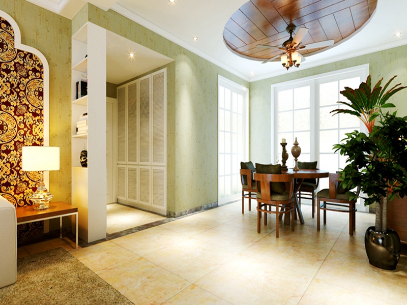 另一個(gè)角度看客廳,業(yè)主提倡低碳環(huán)保,對(duì)大自然有著深深地?zé)釔?ài),所以設(shè)計(jì)師把自然的綠引入了室內(nèi),整體以養(yǎng)眼的綠色墻紙鋪貼,復(fù)古的地磚,草坪質(zhì)感的地磚......