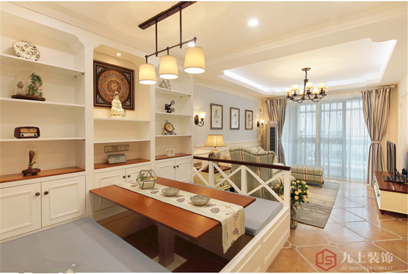 極具典型的美式風(fēng)格客廳,藍(lán)色的沙發(fā)背景墻,相框畫,吊燈,都是美式的代表特點(diǎn)。