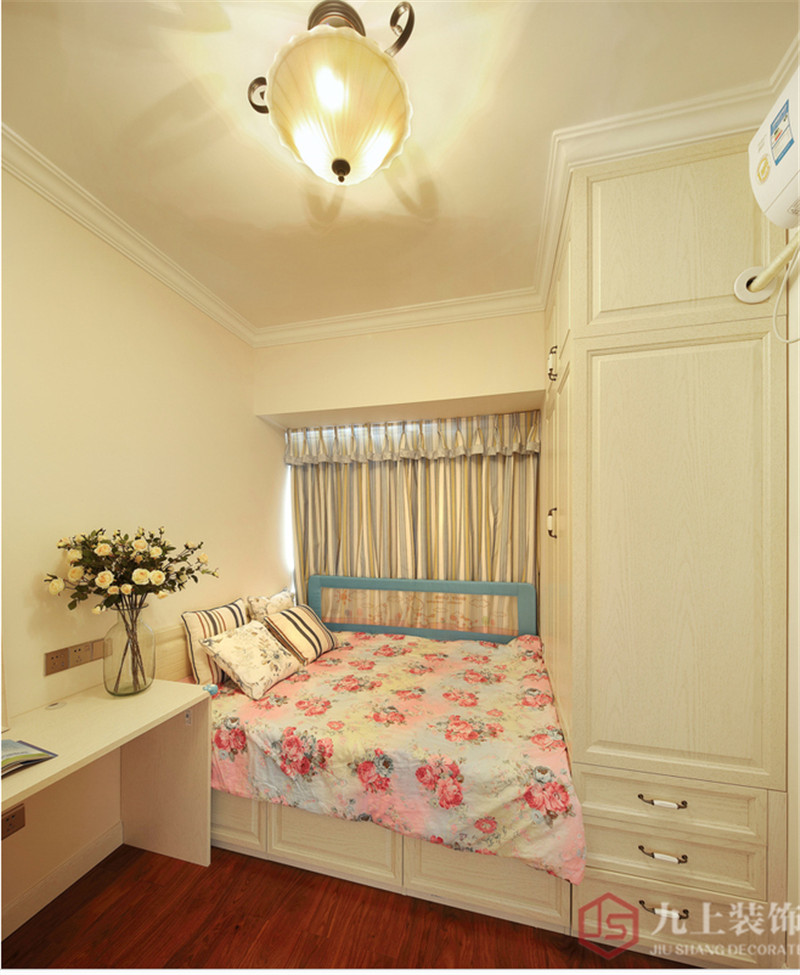 臥室的格局受限于戶型的大小,美式的溫馨和格局并沒有完全得到釋放,還好強(qiáng)大的收納功能,壁柜和書桌臺,都被發(fā)揮極致,合理利用轉(zhuǎn)角,人性化布局,科學(xué)又符合生活習(xí)慣。
