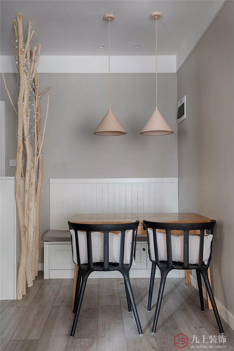 更多的原木元素融入餐廳空間,樹干作為餐廳的隔斷設置,沒有浮夸的裝飾或色彩,一切關于北歐設計的態(tài)度均在平靜溫和的基礎色調中被溝通。