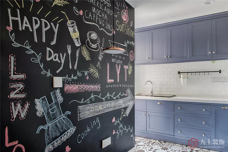 廚房被設置為開放式廚房,鏈接餐廳,位于旁邊的入戶位置,格局采用開放式設計串連廚房餐廳與入戶,相得益彰。在簡潔的裝飾中添加滿墻黑板手繪畫和拼花地磚,賦予小宅清新自由的流通感。