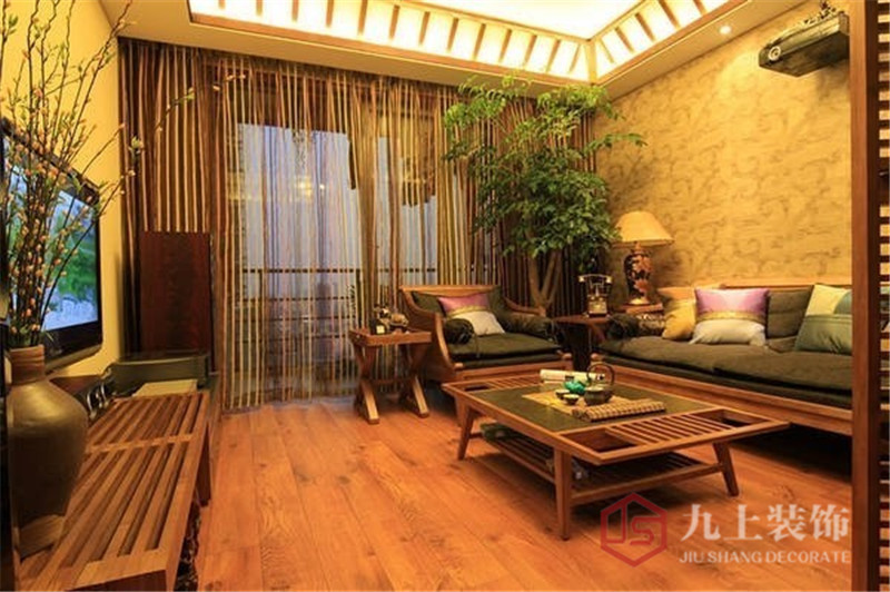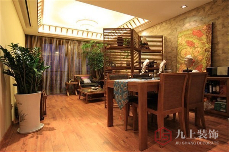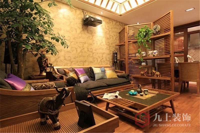 屏風(fēng)與沙發(fā)茶幾的樣式一致,線條簡潔明了,中間打造出隔板,可擺放一些東南亞韻味的飾品,營造出雅致的居家氛圍