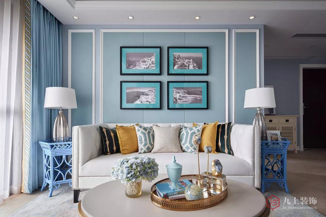 客廳配色很豐富,淡藍(lán)色的基調(diào)下搭配了很多精致的軟裝,米色布藝沙發(fā)+各種色彩的抱枕,真是溫馨優(yōu)雅極了。