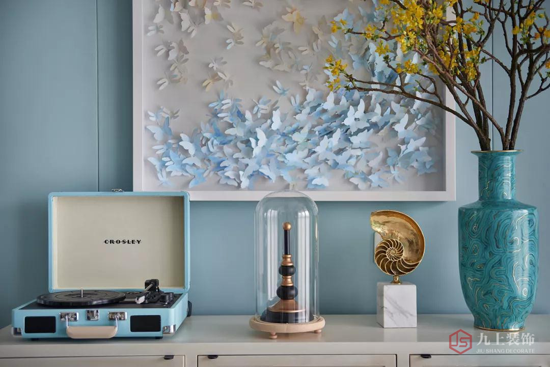 斗柜上面擺放了唱片機(jī),還有美美的湖藍(lán)花瓶,以及一些精致的裝飾品,簡(jiǎn)單一擺,就特別的顯檔次。
