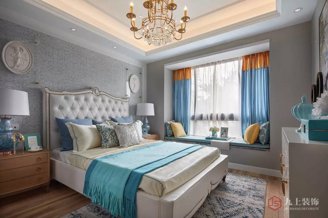 餐廳延續(xù)客廳的淺藍(lán)色調(diào),水晶燈和各種餐具的加入,讓空間看起來(lái)十分的精致。美式餐桌椅優(yōu)雅大方,越看越喜歡。