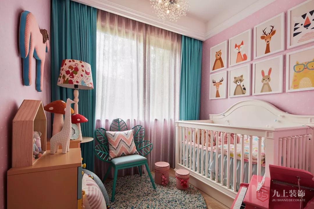 女兒房是粉嫩公主風(fēng),粉粉的墻面,用了各種各樣的動(dòng)物裝飾畫去做搭配,超級(jí)可愛。嬰兒床,小尺寸的家具,都是為孩子量身打造的。