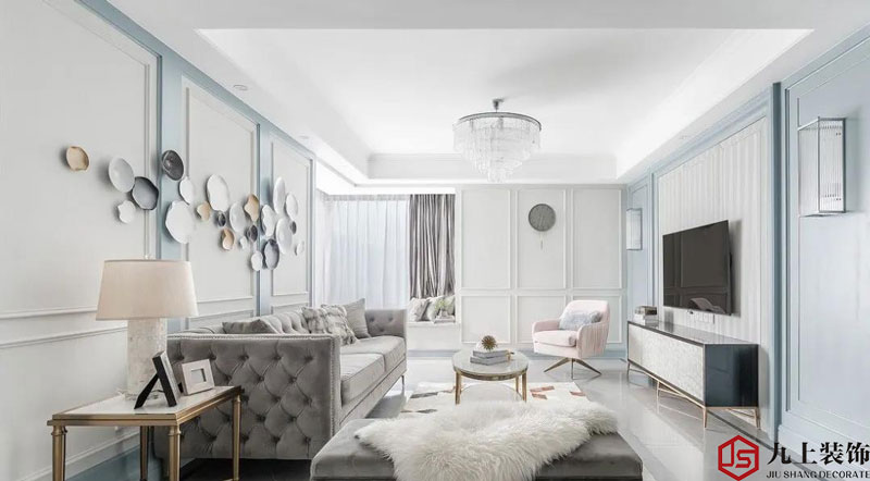 客廳用線框墻板和Pu線條的疊加做出,美式的對稱和層次感,不僅處理了不對稱的結(jié)構(gòu)問題,也拉伸了房子的整體視覺