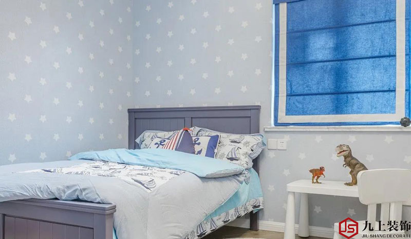 兒童房用色清爽活潑,低飽和度的星星墻紙增添童趣,與家居軟飾達(dá)成風(fēng)格統(tǒng)一